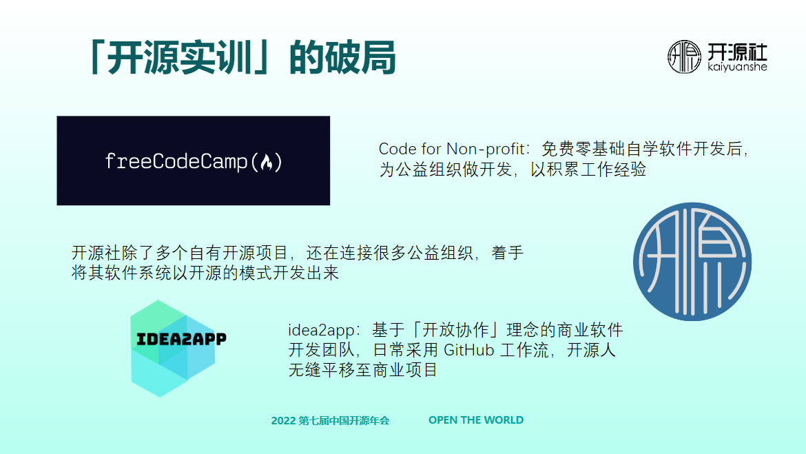 自 2022 年初@水歌担任开源社项目委员会主席伊始,便推动『开源实训』的实验。当年末即完成之前三四年完不成的几大项目开发,获得开源社理事会、顾问委员会(成员为中国各大互联网公司技术高管)高度评价,并迅速培养出多位优秀毕业生担任商业项目的技术主力: